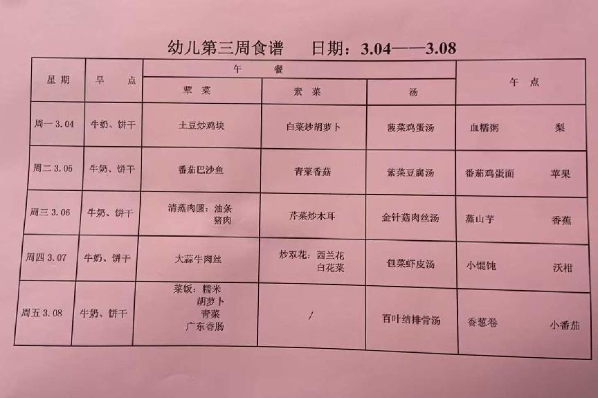 2023~2024第二学期 幼儿食谱 第三周