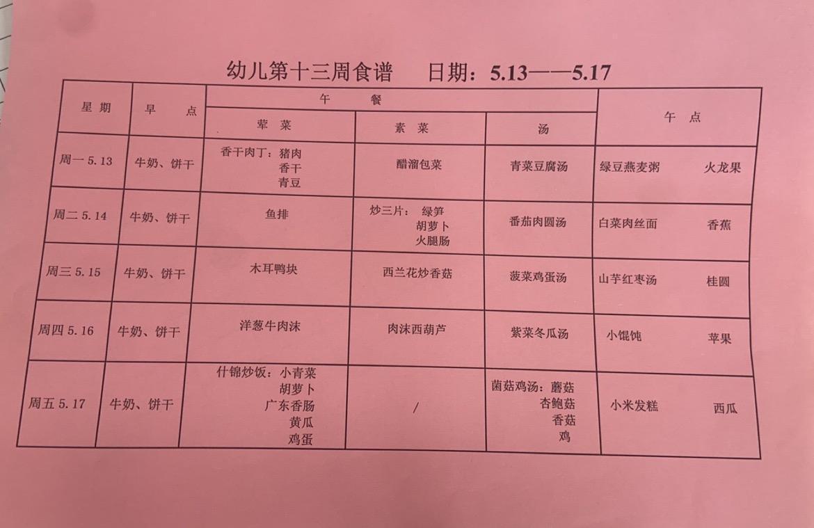2023~2024第二学期 幼儿食谱 第十三周