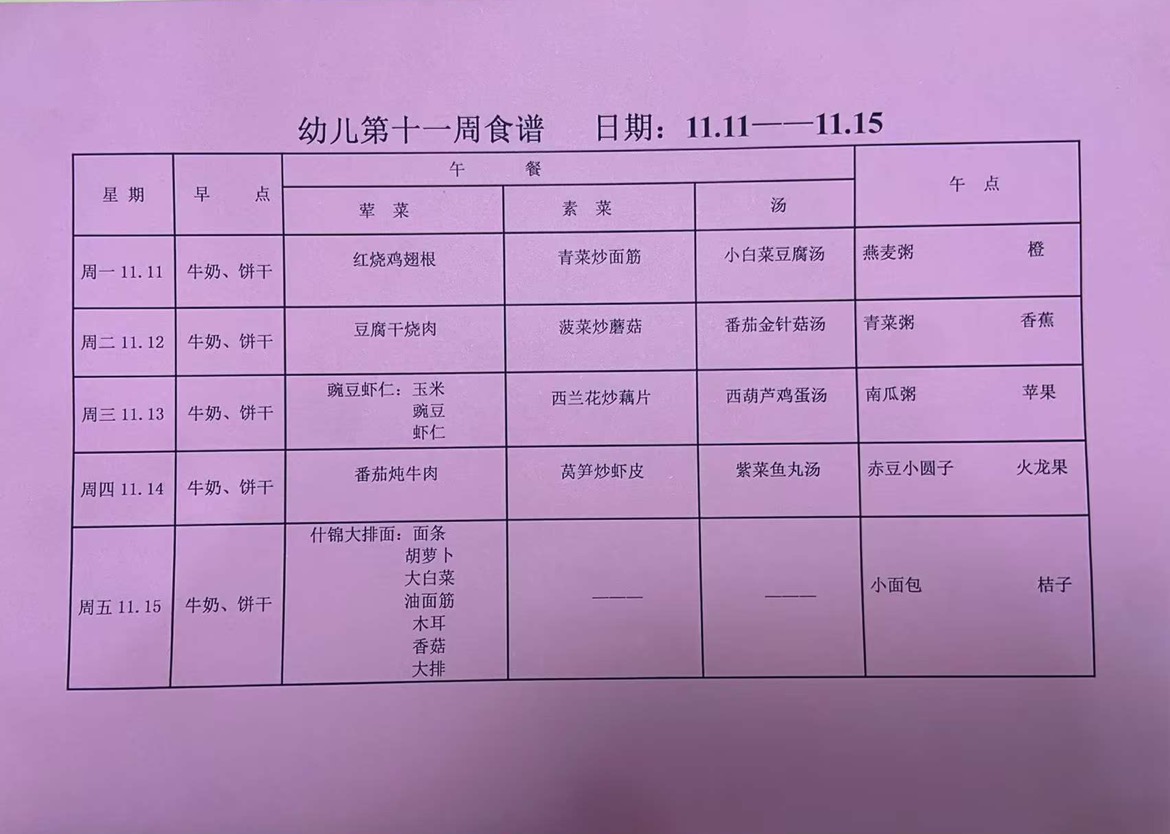 2024~2025第一学期 幼儿食谱 第十一周