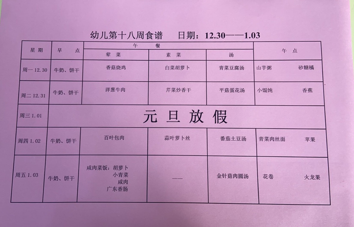 2024~2025第一学期 幼儿食谱 第十八周
