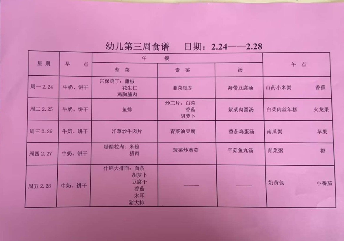 2024~2025第二学期 幼儿食谱 第三周
