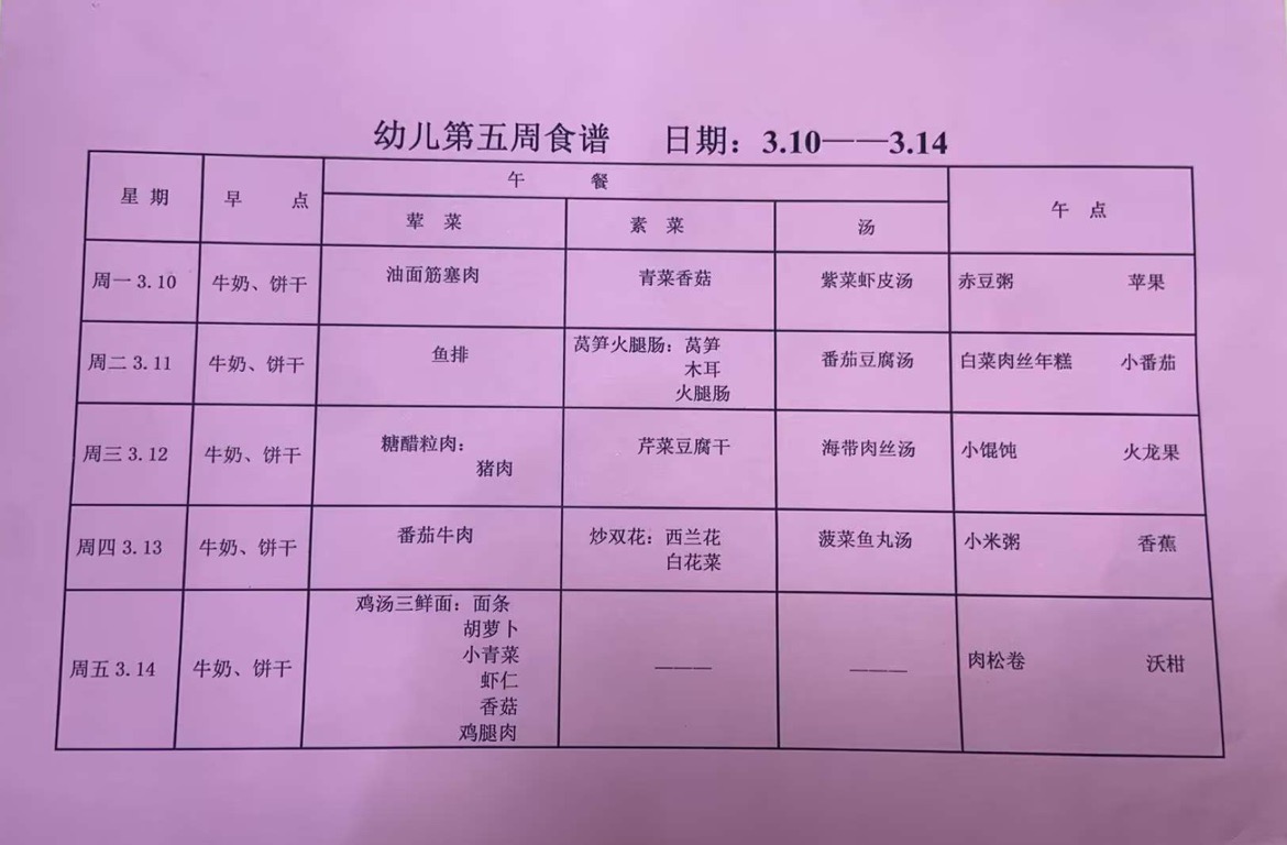 2024~2025第二学期 幼儿食谱 第六周
