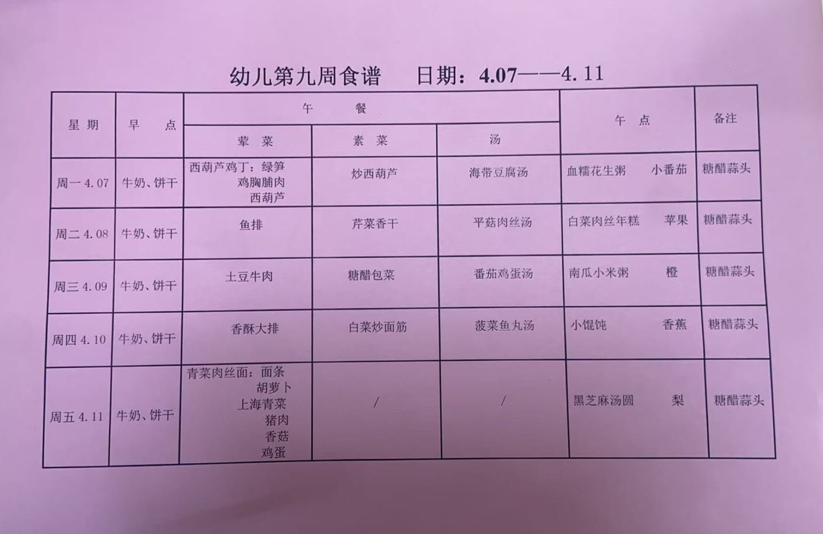 2024~2025第二学期 幼儿食谱 第九周