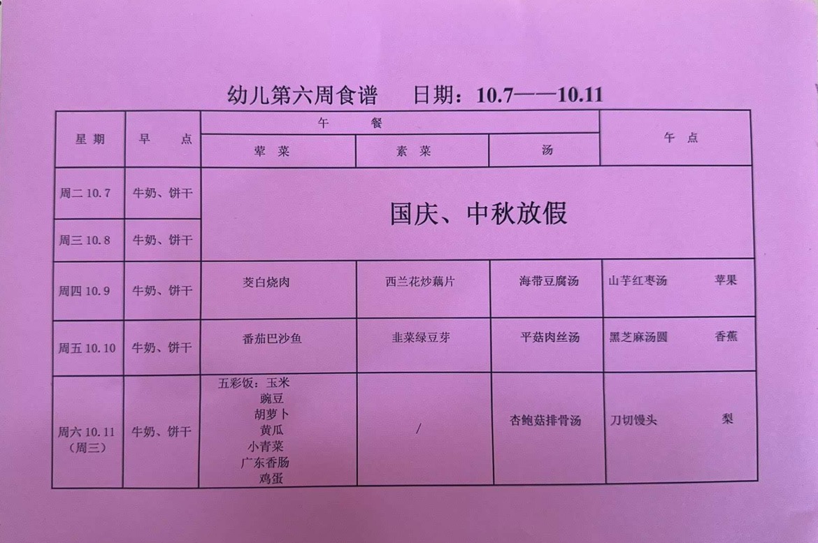 2025~2026第一学期 幼儿食谱 第六周