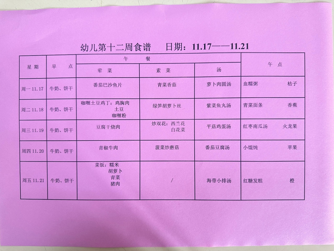 2025~2026第一学期 幼儿食谱 第十二周