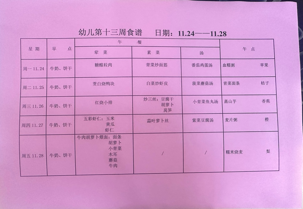 2025~2026第一学期 幼儿食谱 第十三周
